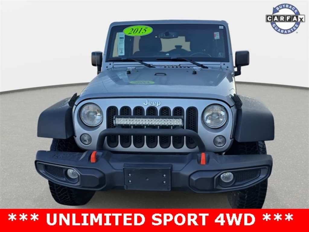 Clean CARFAX. 2015 Jeep Wrangler Unlimited Sport Billet Silver Metallic Clearcoat 4WD 5-Speed Automatic 3.6L V6 24V VVT *RECENT TRADE IN*, *4 WHEEL DRIVE*, 17" x 7.5" Aluminum Wheels, Auto-Dimming Mirror w/Reading Lamp, Black 3-Piece Hard Top, Connectivity Group, Deep Tint Sunscreen Windows, Delete Sunrider Soft Top, Freedom Panel Storage Bag, Front fog lights, Leather Wrapped Steering Wheel, Quick Order Package 24S, Rear Window Defroster, Rear Window Wiper/Washer, Tinted Rear Quarter & Liftgate Windows, Tire Pressure Monitoring Display, Uconnect Voice Command w/Bluetooth, Vehicle Information Center.