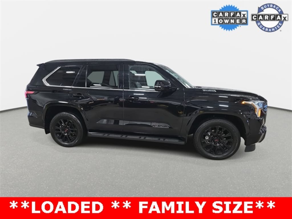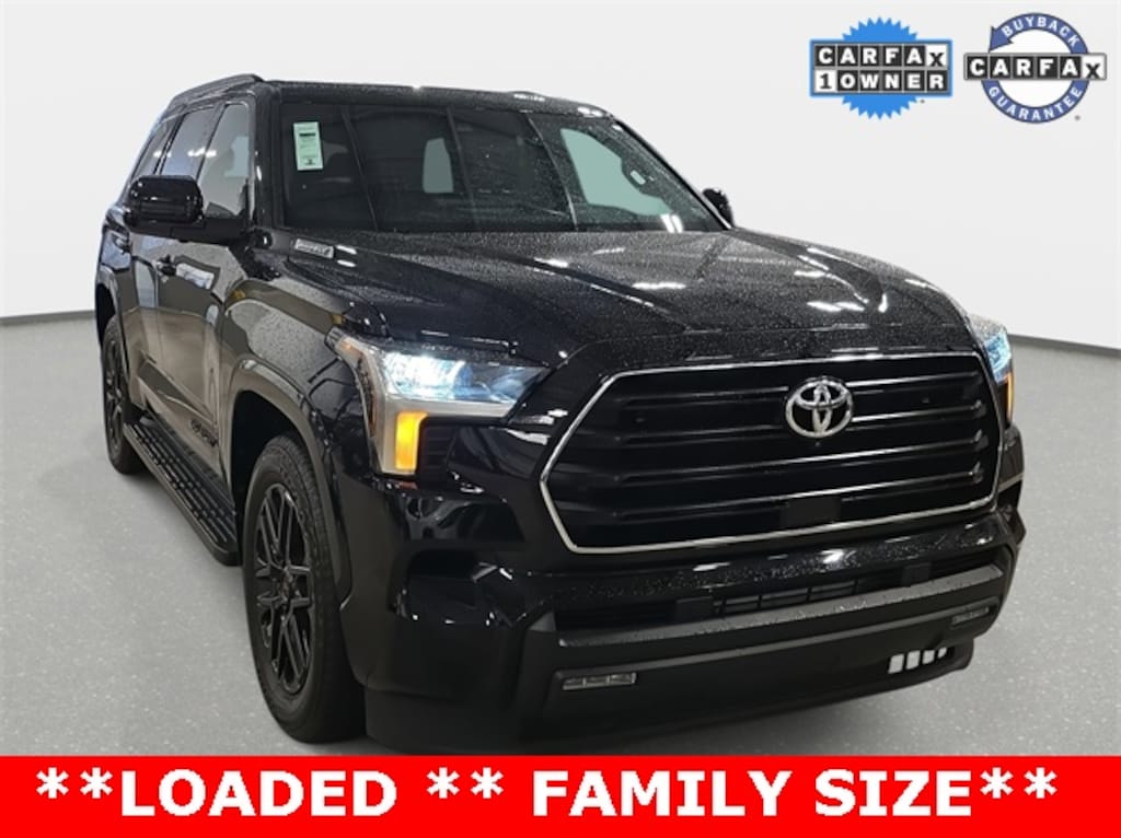 CARFAX One-Owner. 2025 Toyota Sequoia SR5 Black 4WD 10-Speed Automatic V6 Hybrid *ONE OWNER*, *RECENT TRADE IN*, *BLUETOOTH*, *NAVIGATION*, *SUNROOF*, *THIRD ROW SEATS*, *APPLE CARPLAY/ANDROID AUTO*, *ALUMINUM ALLOY WHEELS*, *SIRIUS XM*, *LEATHER*, *4 WHEEL DRIVE*, V6 Hybrid, 10-Speed Automatic, 4WD, 400W/120V Rear Cabin & Cargo Area AC Power Supply, Apple CarPlay/Android Auto, Auto High-beam Headlights, Exterior Parking Camera Rear, Front fog lights, Hands-Free Power Liftgate, Headlight cleaning, Heated Front Seats, Heated front seats, Power Folding 3rd Row Seat, Power moonroof, Radio: 14" Toyota Audio Multimedia, Security system, SofTex Seat Trim, SR5 Premium Package, Wheels: 18" Styled-Alloy.
